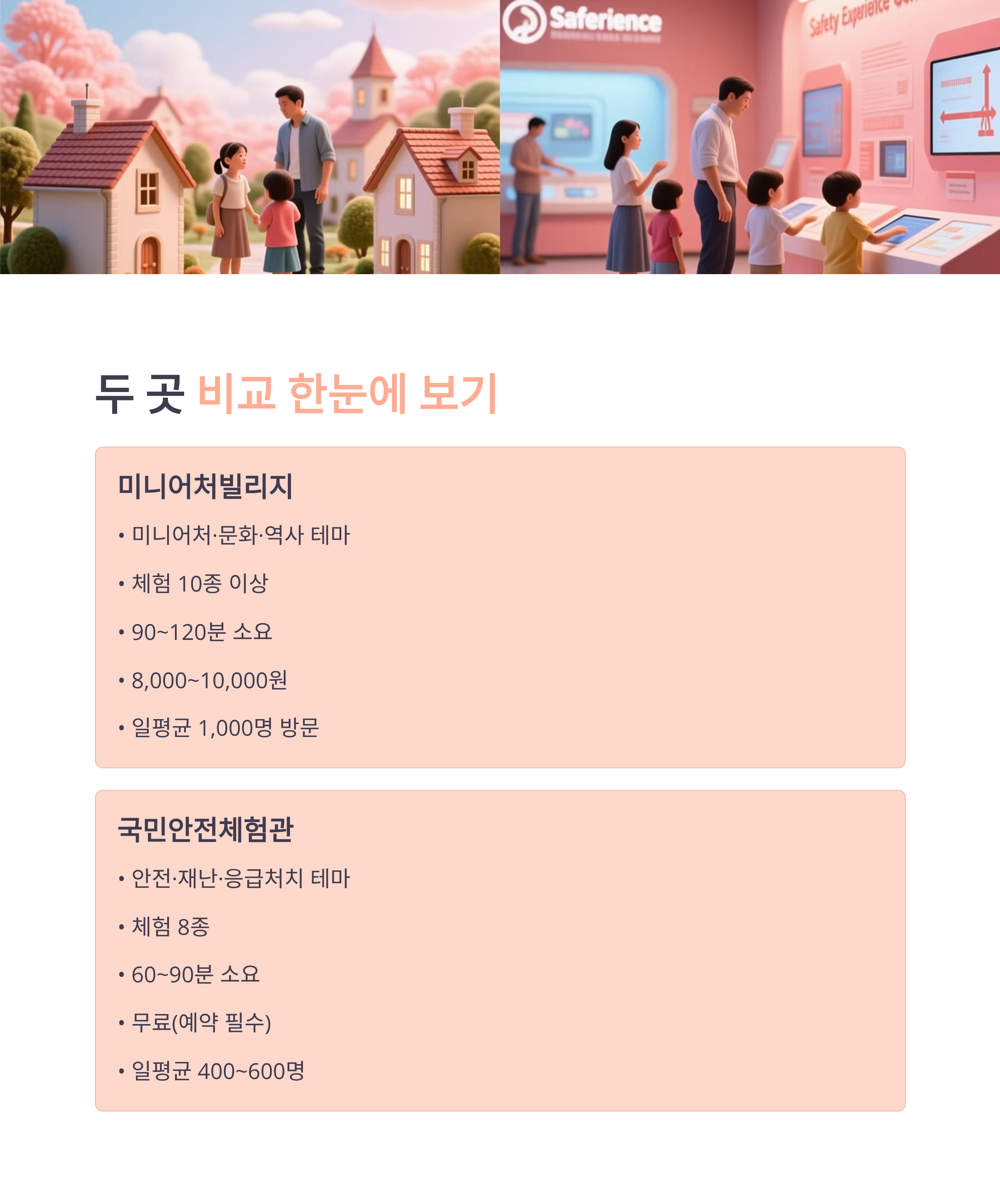- 미니어처 빌리지는 주말 오전(10~13시), 안전체험관은 평일 오전에 혼잡