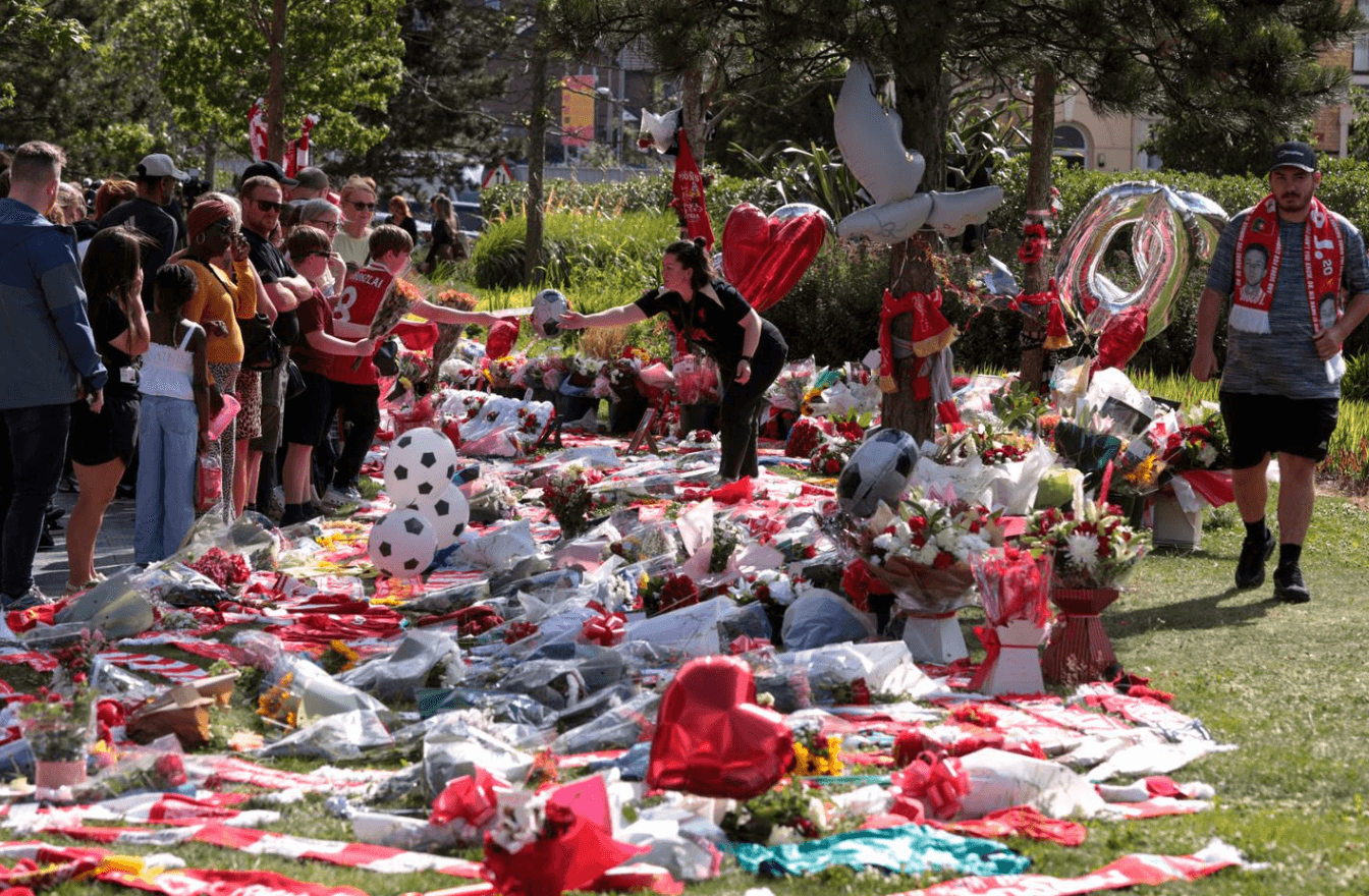 수많은 팬이 그가 마지막으로 뛰었던 안필드 경기장에서 헌화하고 있습니다.