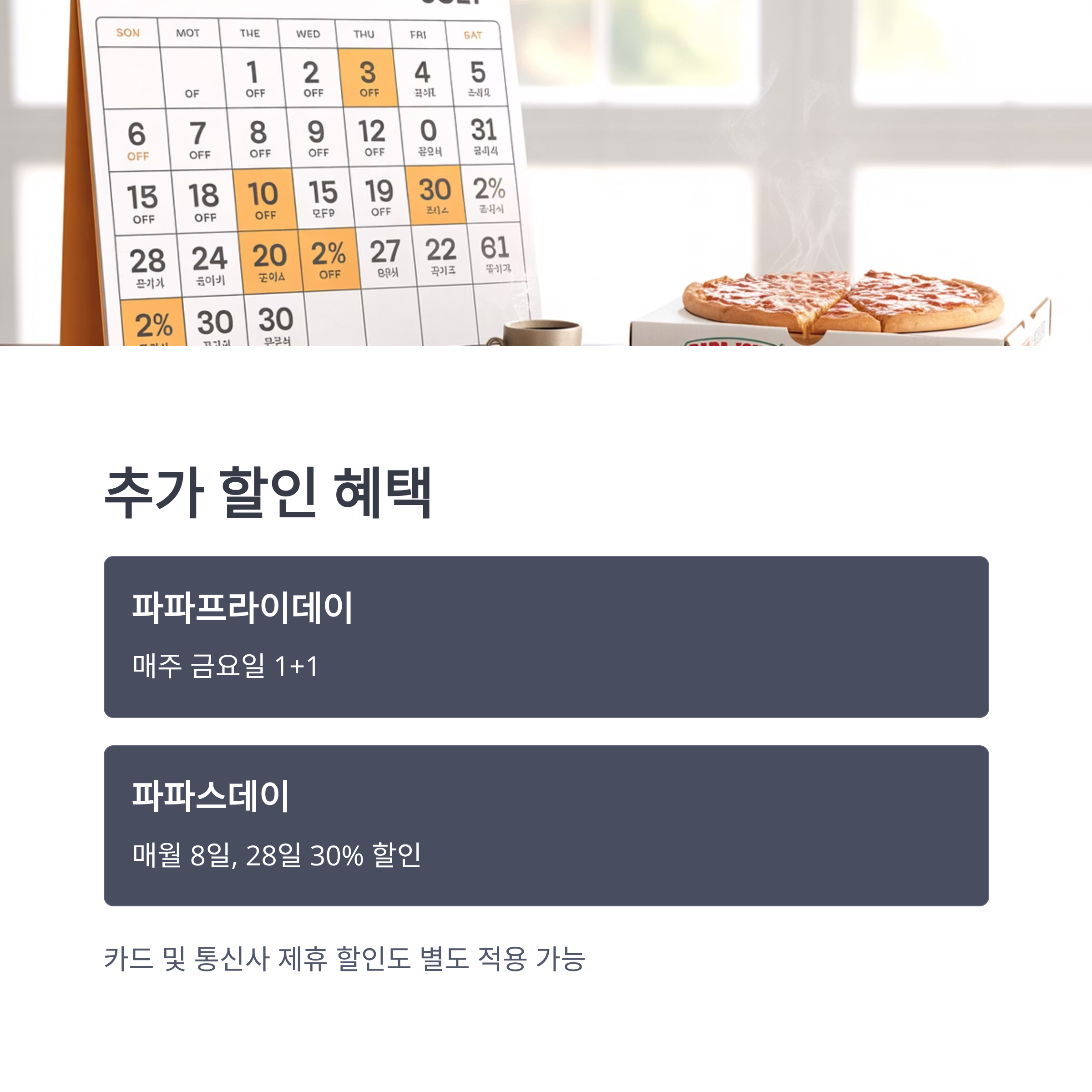 - 파파스데이: 매월 8일·28일, 피자 30% 할인