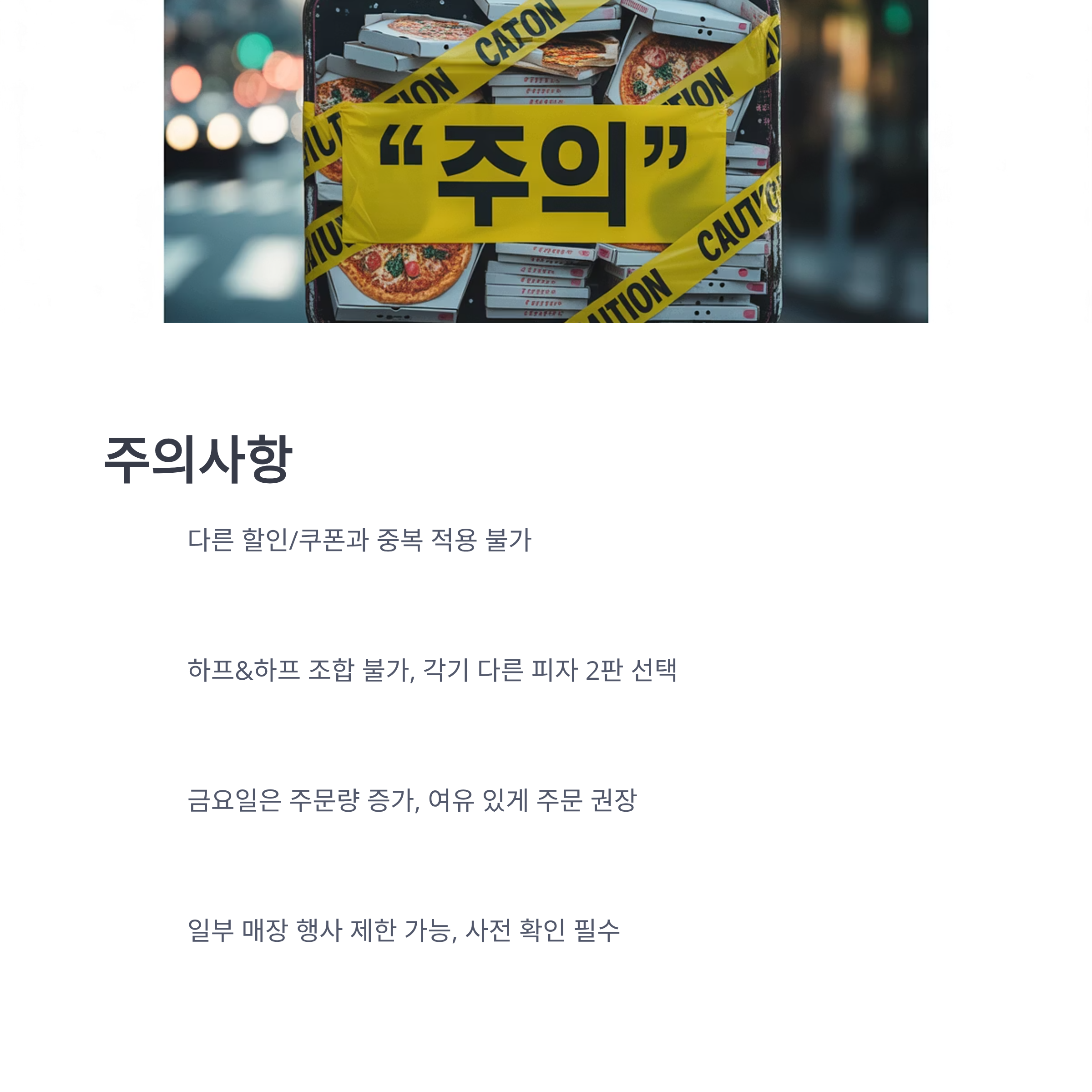 이번 포스팅에서는 적용 메뉴, 가격, 주문 방법, 그리고 주의사항까지 한눈에 정리해 드리니 금요일 피자파티를 준비하는 분들은 꼭 참고하세요! 🍕