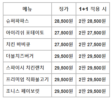 - 혜택: 인기 라지 사이즈 피자 1+1 (2판을 1판 가격으로)
