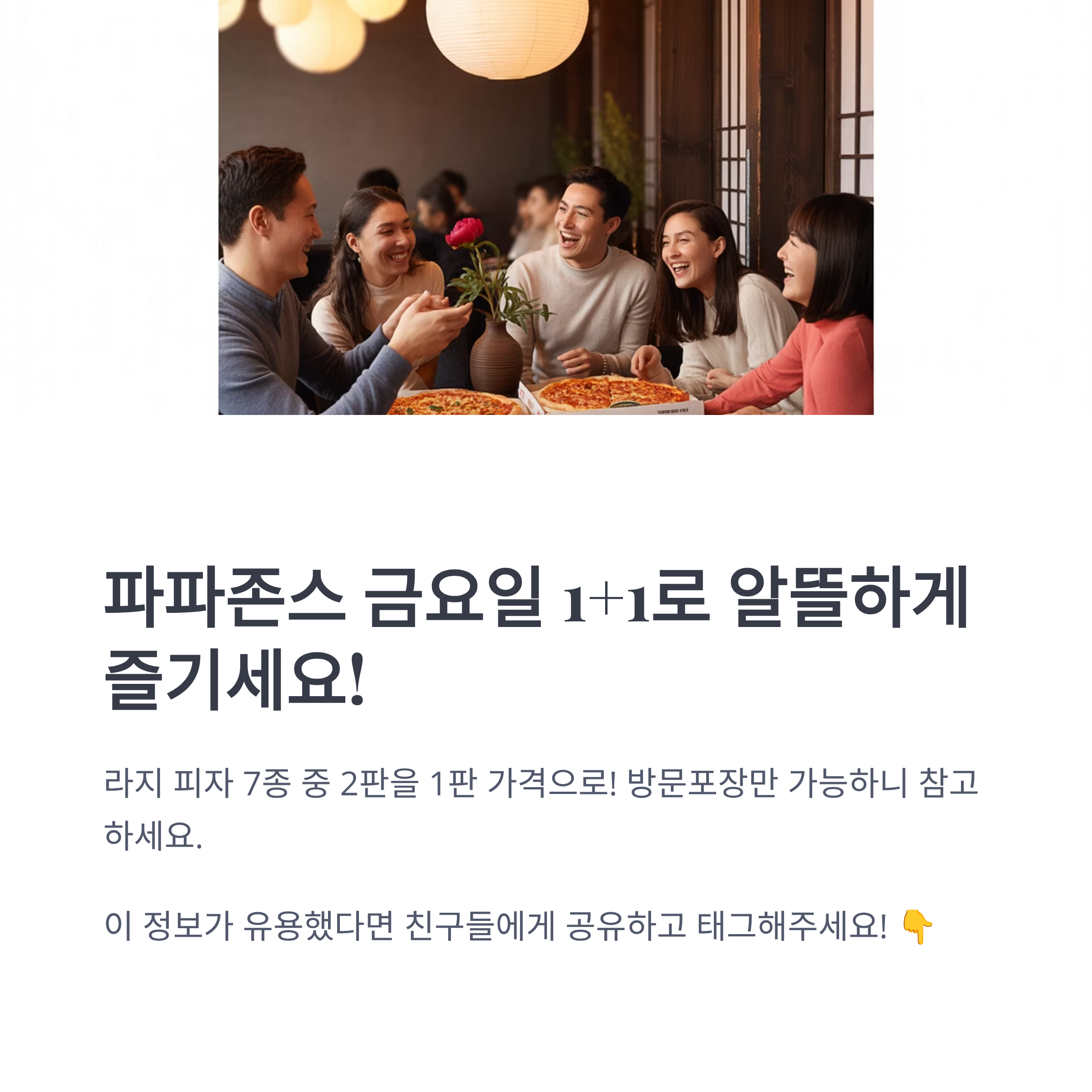 금요일마다 두 판의 피자를 한 판 가격에 즐길 수 있는 파파존스 파파프라이데이(PAPA Friday) 1+1 이벤트는 2025년에도 가장 인기 있는 할인 행사입니다.