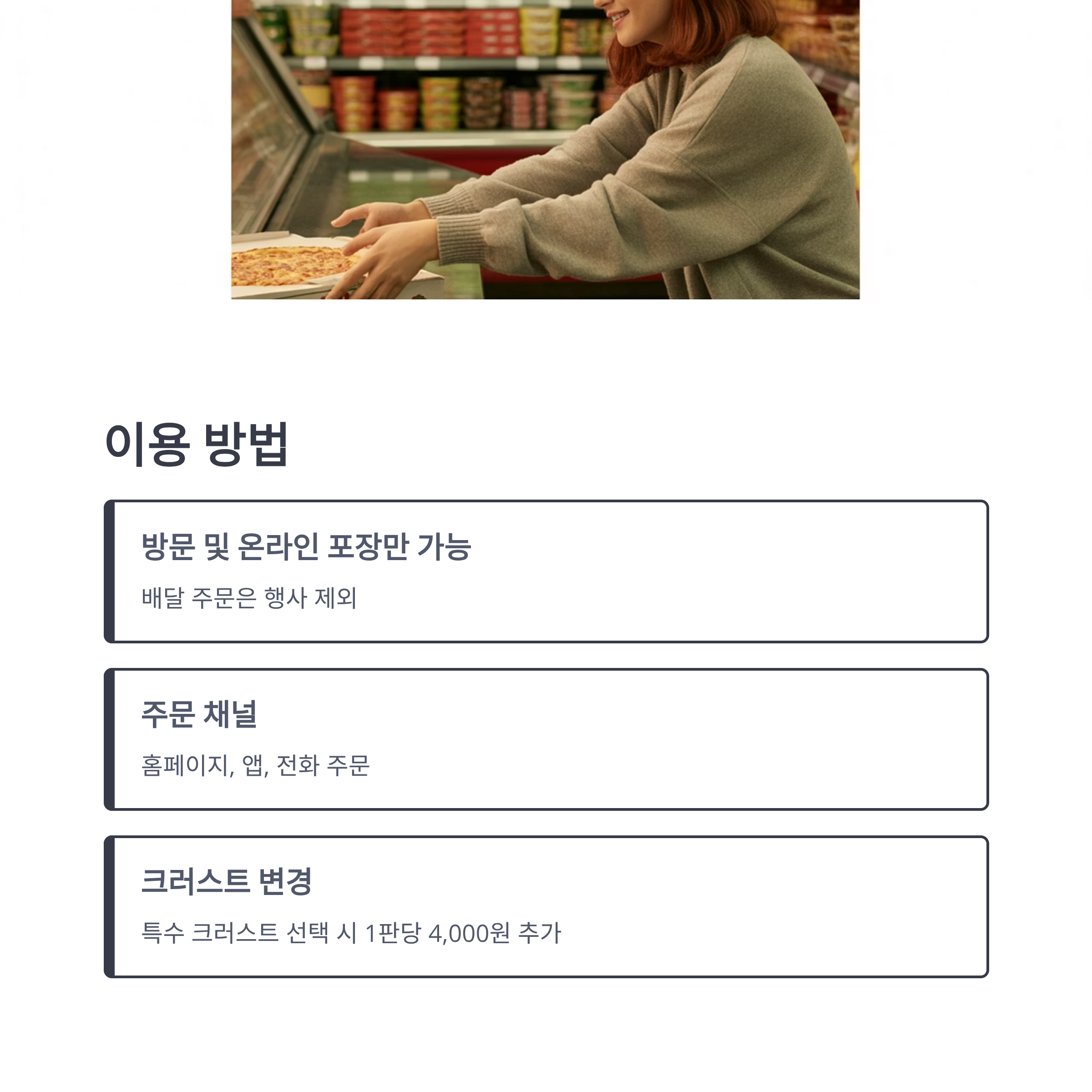 단, 포장 전용이라는 점과 크러스트 변경 시 추가 비용이 있다는 점을 기억하세요.