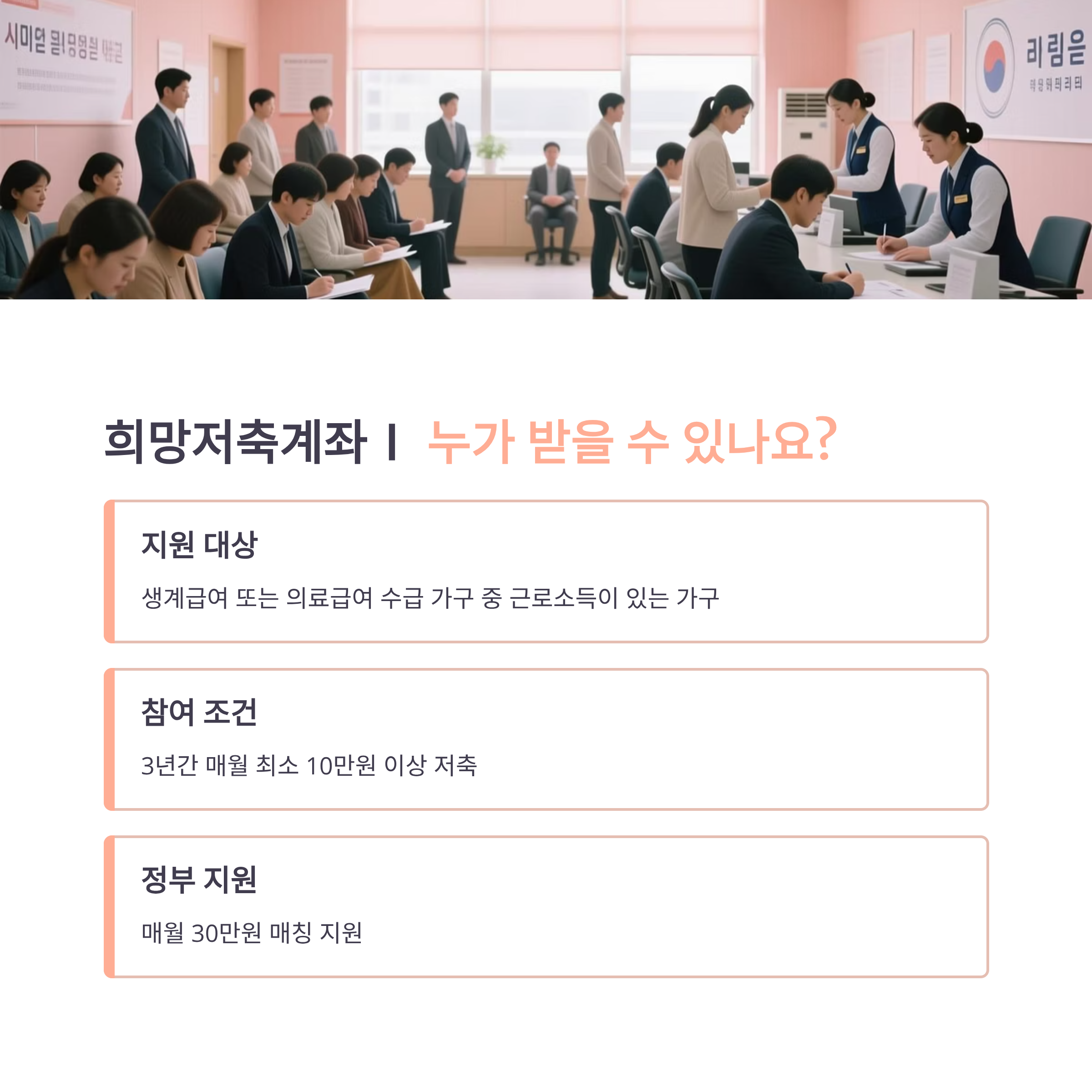 - 희망저축계좌Ⅰ: 생계·의료급여 가구, 월 10만 원 이상 저축 + 정부 월 30만 원 지원