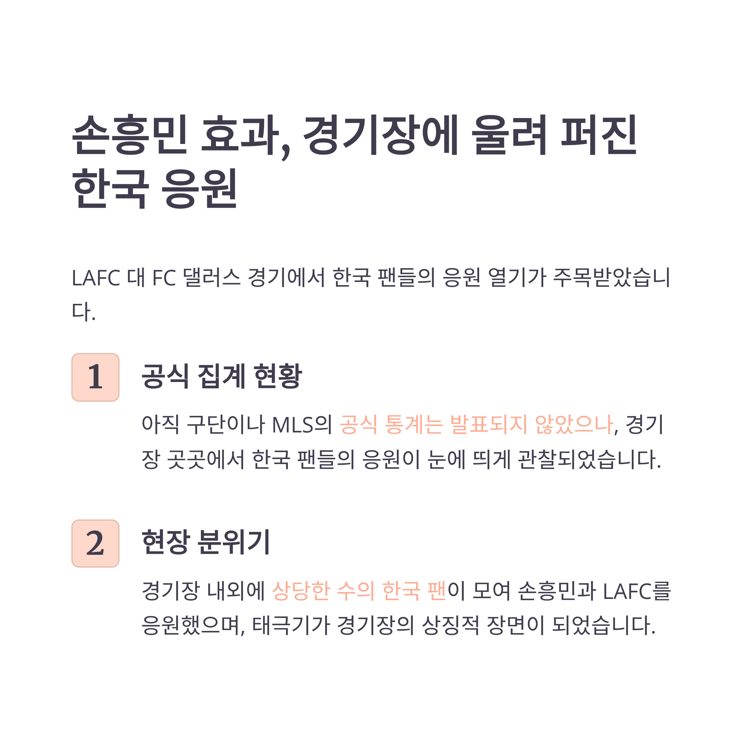- 경기장 안팎에서 태극기 물결이 이어지며, 손흥민의 MLS 데뷔골과 맞물려 뜨거운 분위기 연출