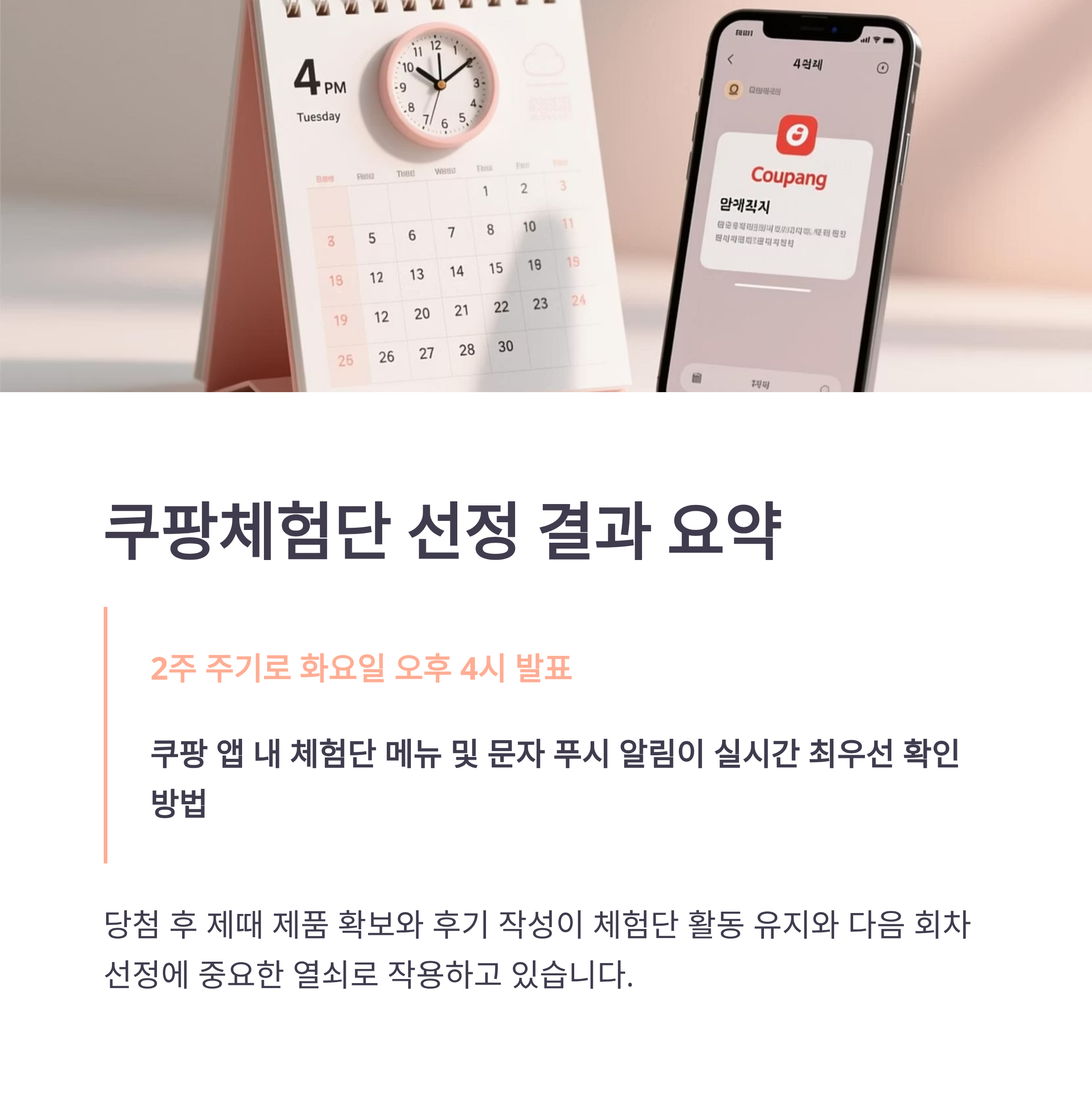 2025년 쿠팡 체험단은 격주 화요일 오후 4시 발표, 쿠팡 앱과 문자 알림을 통해 가장 빠르게 당첨 여부를 확인할 수 있습니다.
