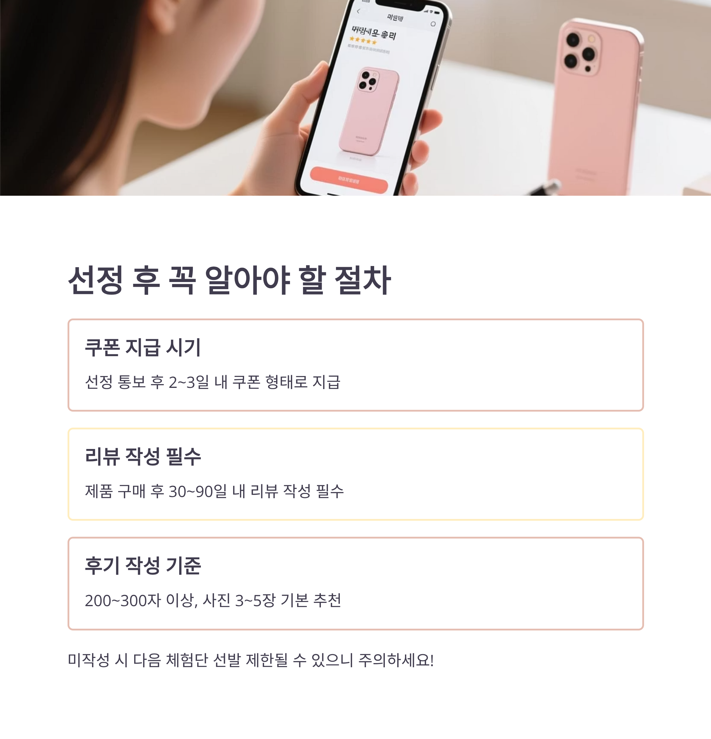 - 제품별 유의사항 확인: 체험단 상품마다 작성 조건이나 추가 안내가 다를 수 있으므로 반드시 체크