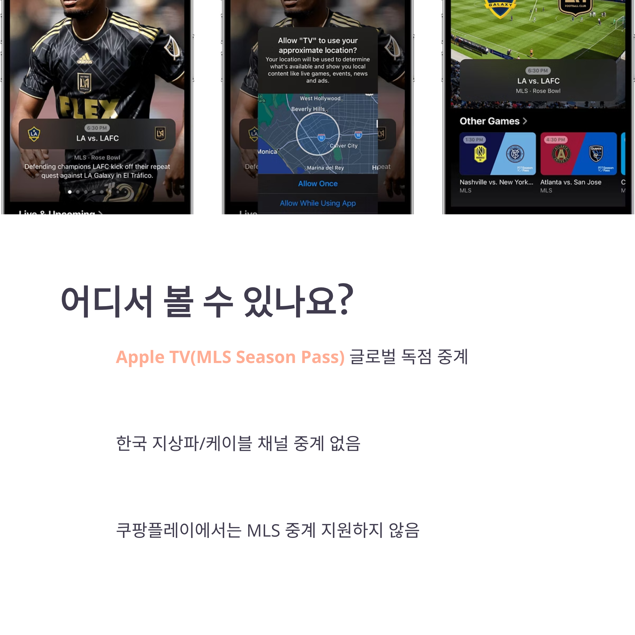 - Apple TV (MLS Season Pass): 글로벌 독점 중계 (한국 포함)