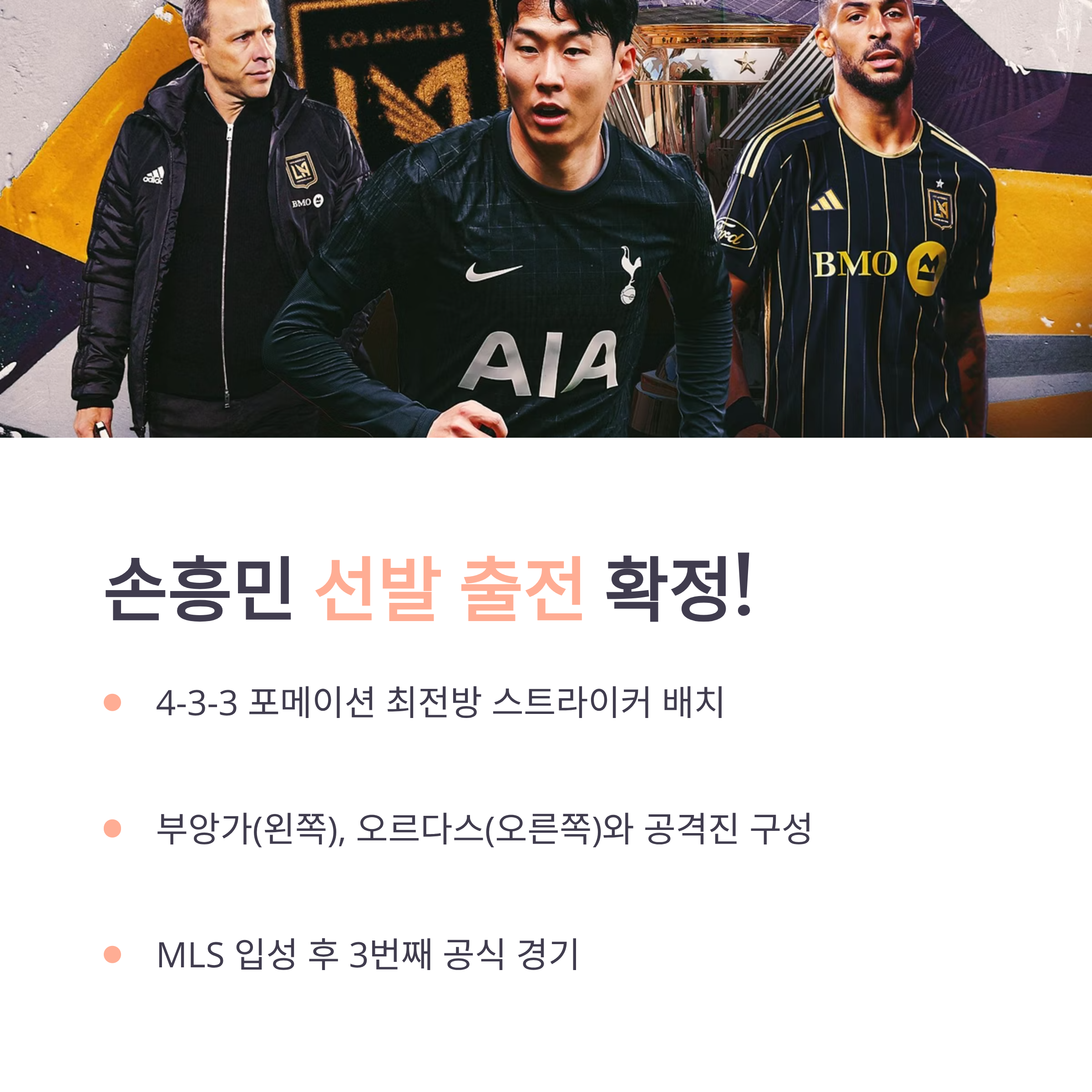 팬들의 뜨거운 관심 속에 손흥민의 3번째 MLS 출전이자 연속 선발 출전이 확정되었습니다.