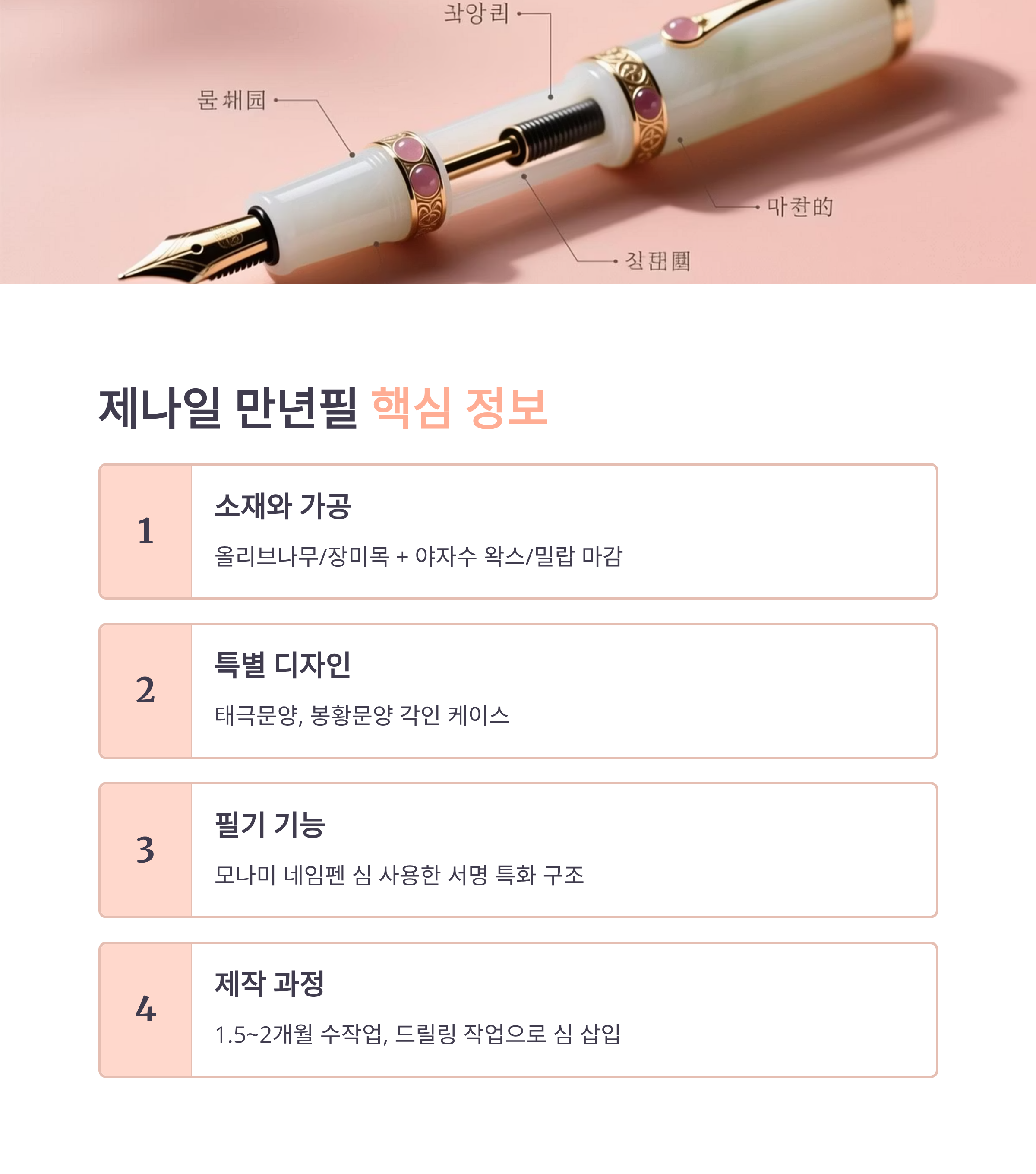 이번 만년필은 대통령실의 특별 주문으로 제작된 고급 수공예품으로, 한국 전통과 장인의 기술이 결합된 상징적인 외교 선물로 평가받고 있습니다.