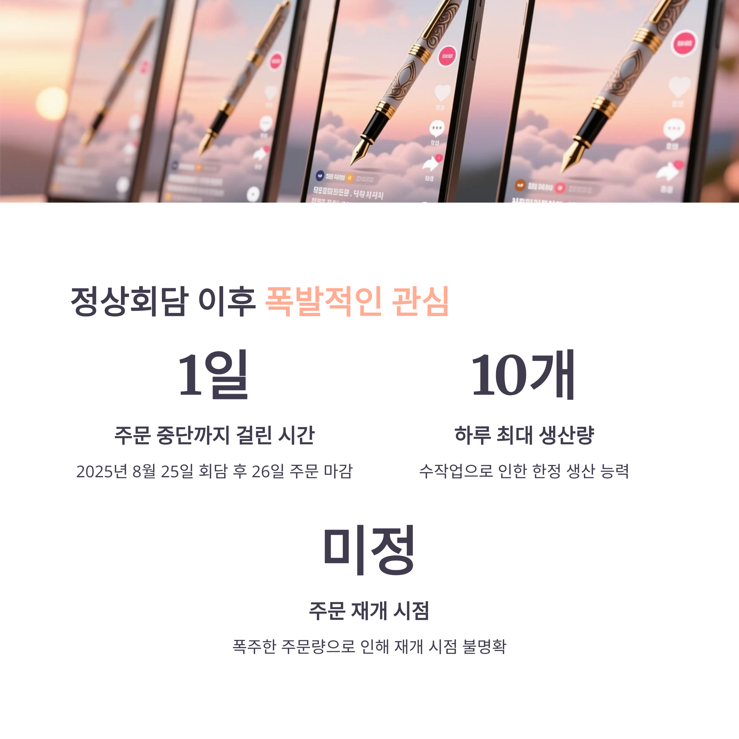 - 장인 제작 특성상 하루 10개 수준 생산 가능 → 판매 즉시 품절 사태 발생