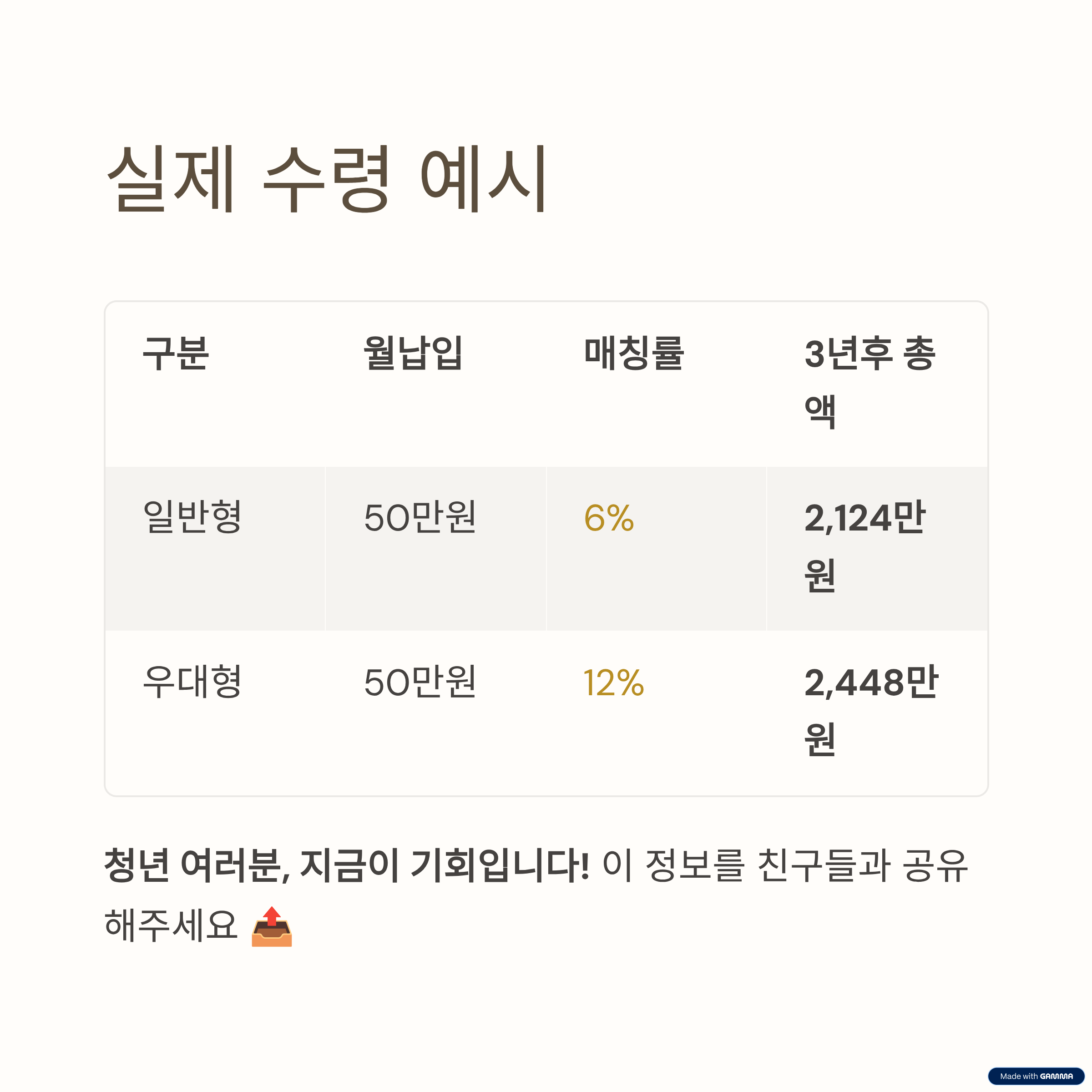 - 우대형: 원금 1,800만 원 + 정부지원금 약 648만 원 = 총 약 2,448만 원