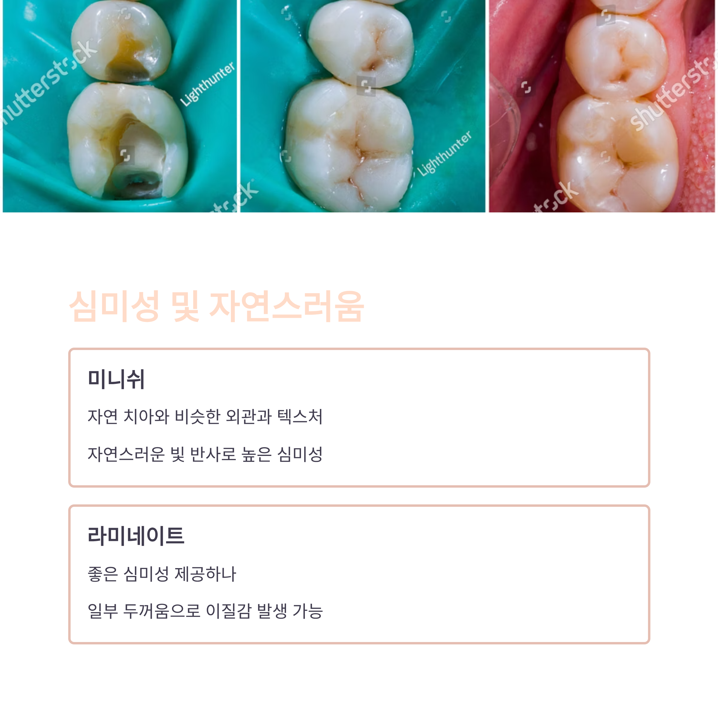 - 미니쉬: 앞니·어금니 모두 적용 가능. 치아 균열, 손상, 변색, 파절 등 다양한 문제 해결 가능.