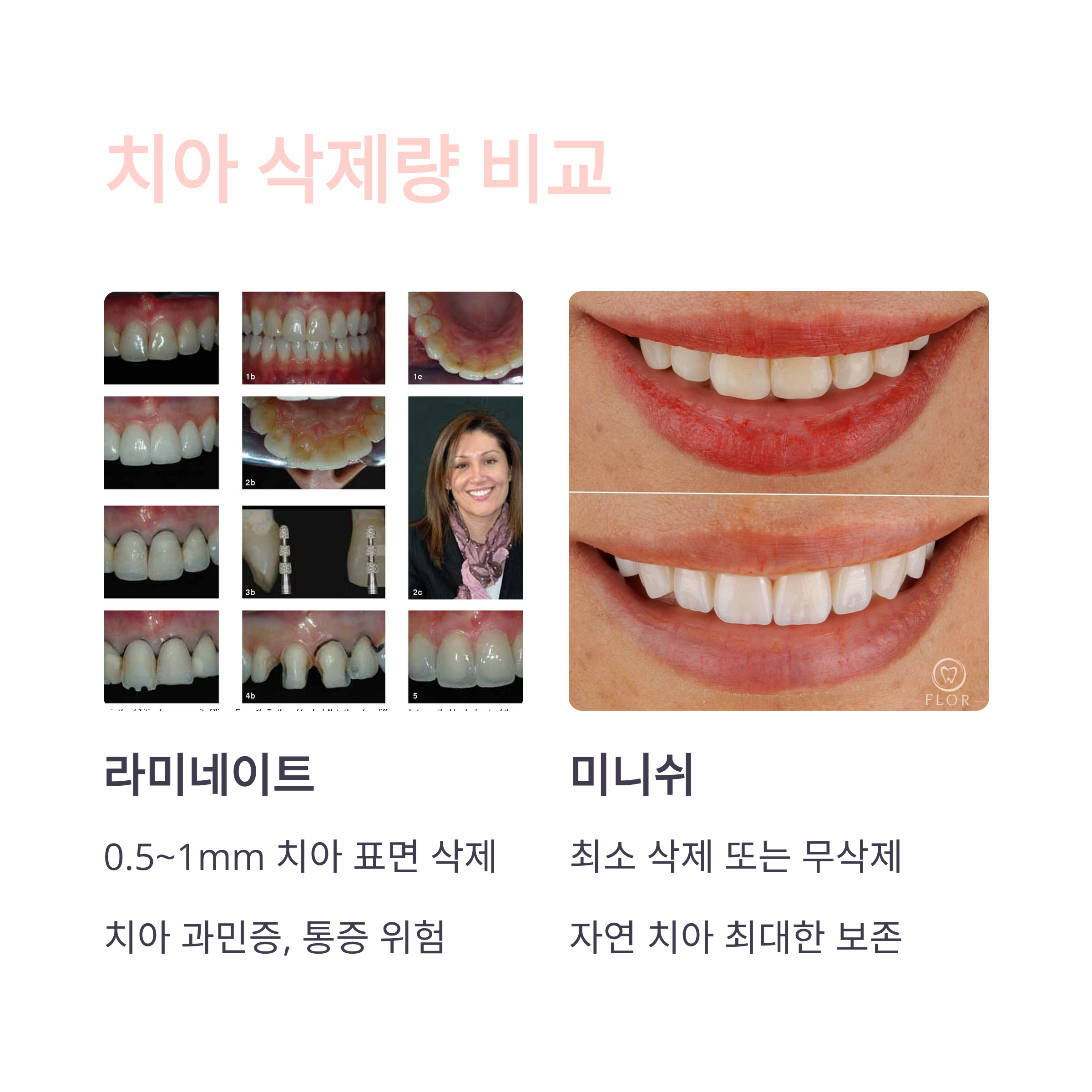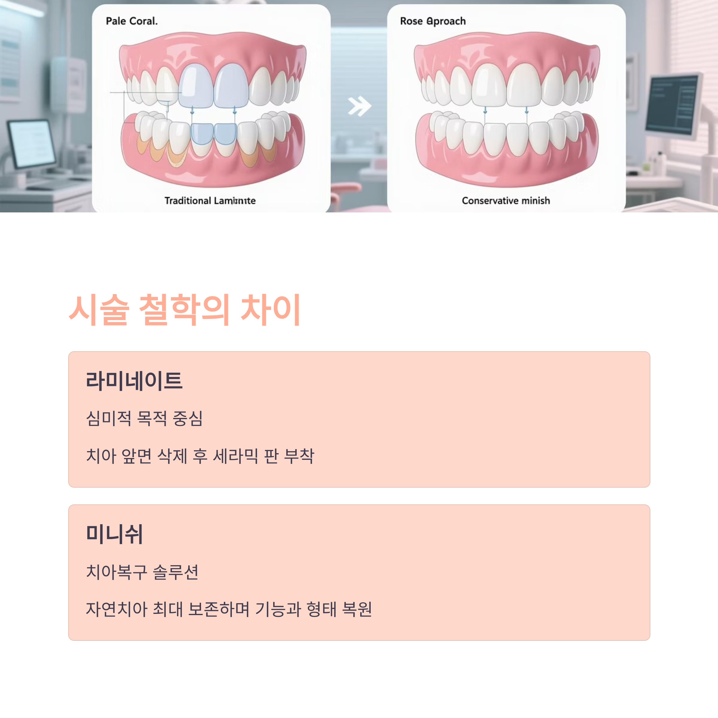 - 미니쉬: 최소 삭제 또는 무삭제 방식 적용 → 자연 치아 보존 극대화, 정밀한 시술 필요.