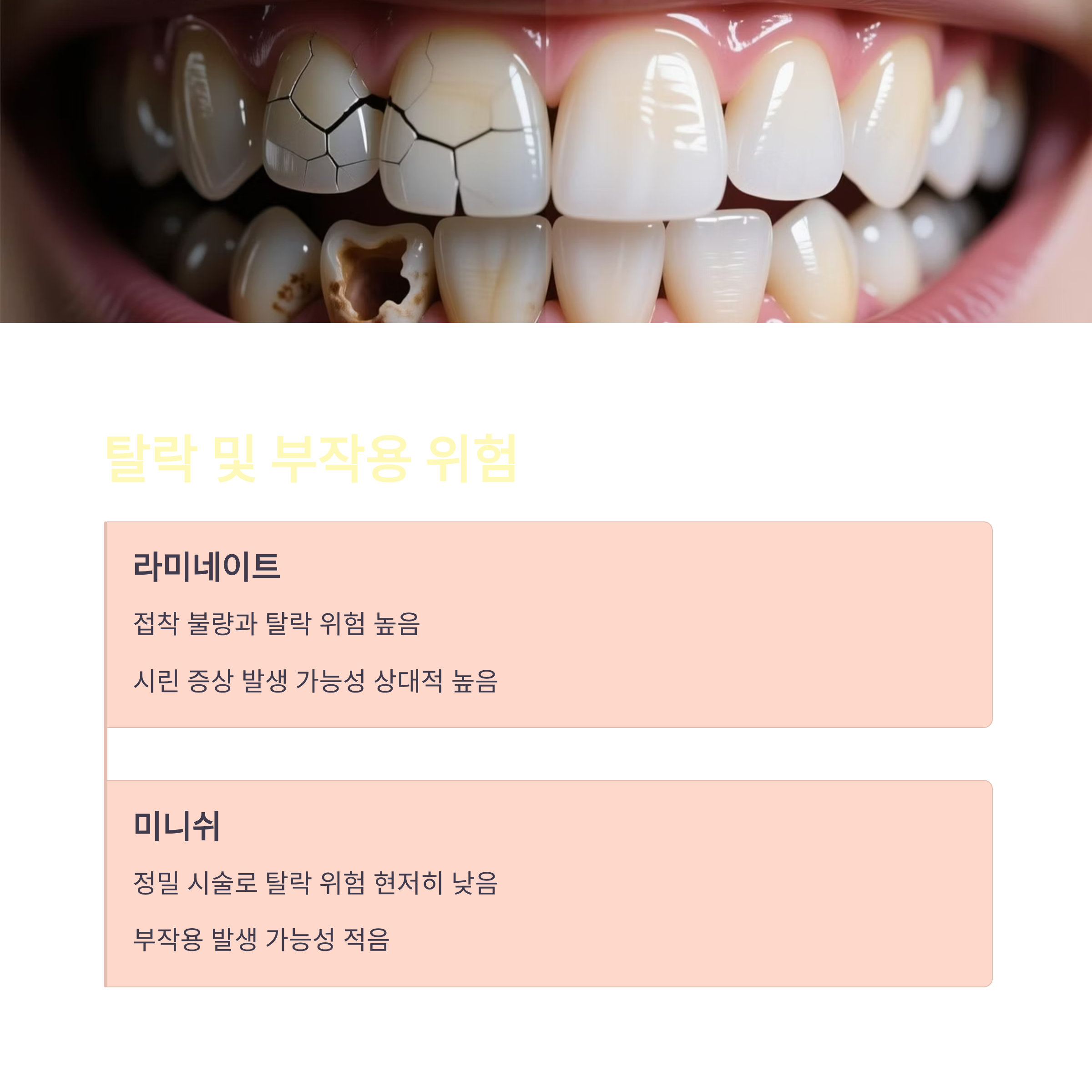 - 라미네이트: 치아 표면 삭제가 필수 → 장기적으로 치아 약화 가능성.