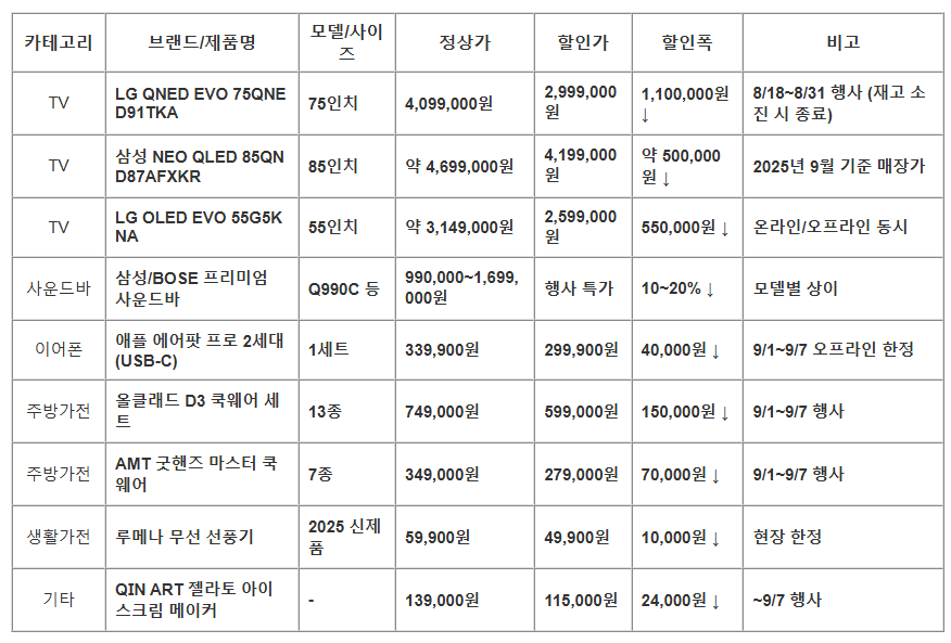 특히 LG QNED, 삼성 Neo QLED, 애플 에어팟 프로 등은 조기 종료 가능성이 크므로 빠른 구매를 추천드립니다.