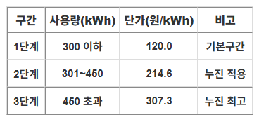 예시) 500kWh 사용 시: 120×300 + 214.6×150 + 307.3×50 = 약 99,345원 (기본료, 부가세, 환경요금 별도)