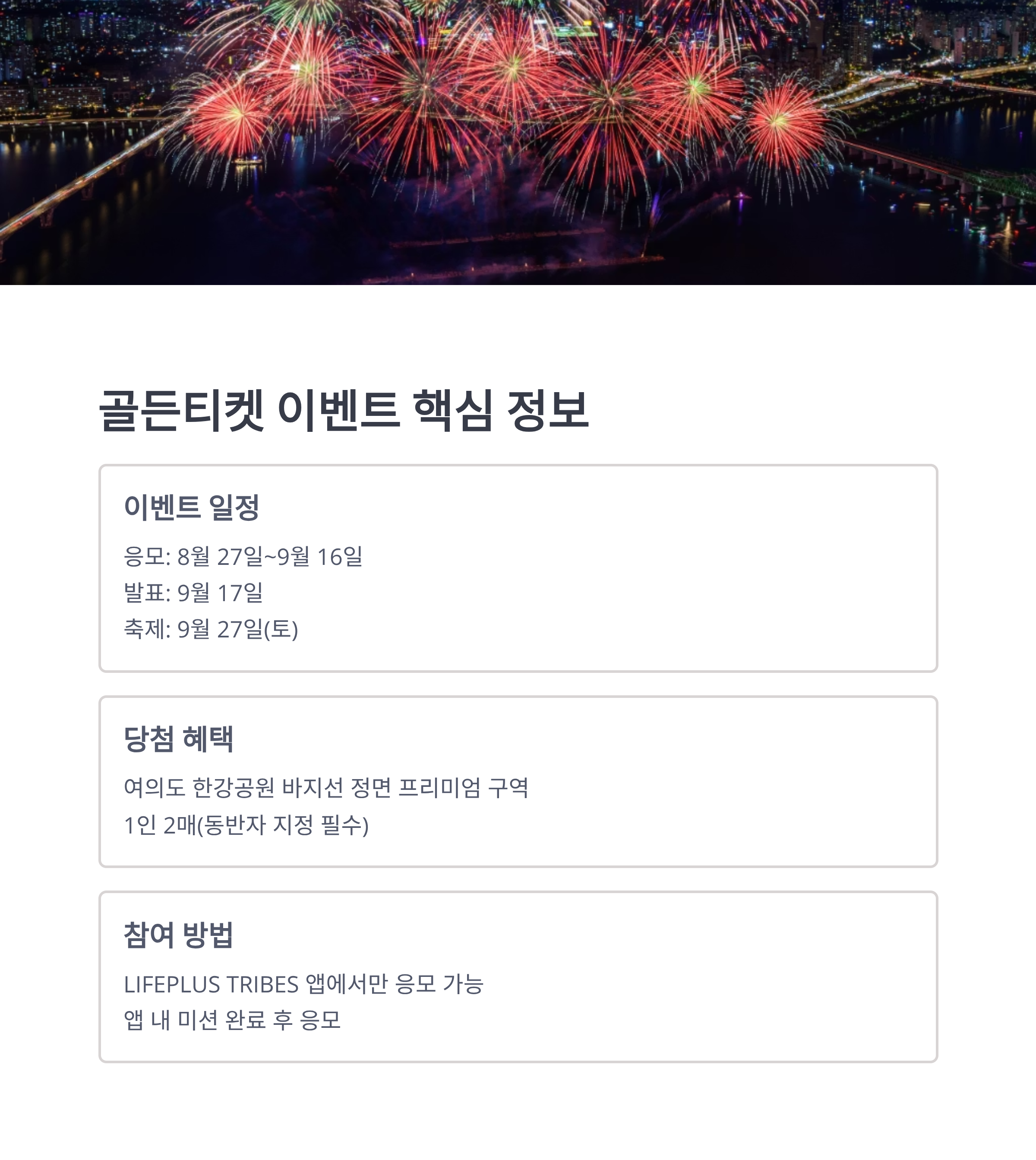 한화그룹과 LIFEPLUS가 주최하는 이번 골든티켓 이벤트는 여의도 불꽃축제의 ‘프리미엄 존’ 입장권을 제공하는 특별한 추첨 행사입니다.