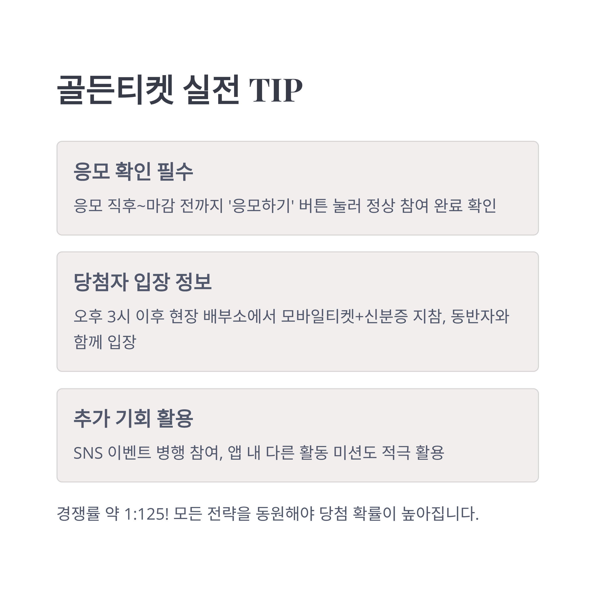 경쟁률이 무려 1:125에 달하는 이번 골든티켓 이벤트는 단순 추첨이 아닌, 전략과 타이밍이 당첨 확률을 좌우합니다.