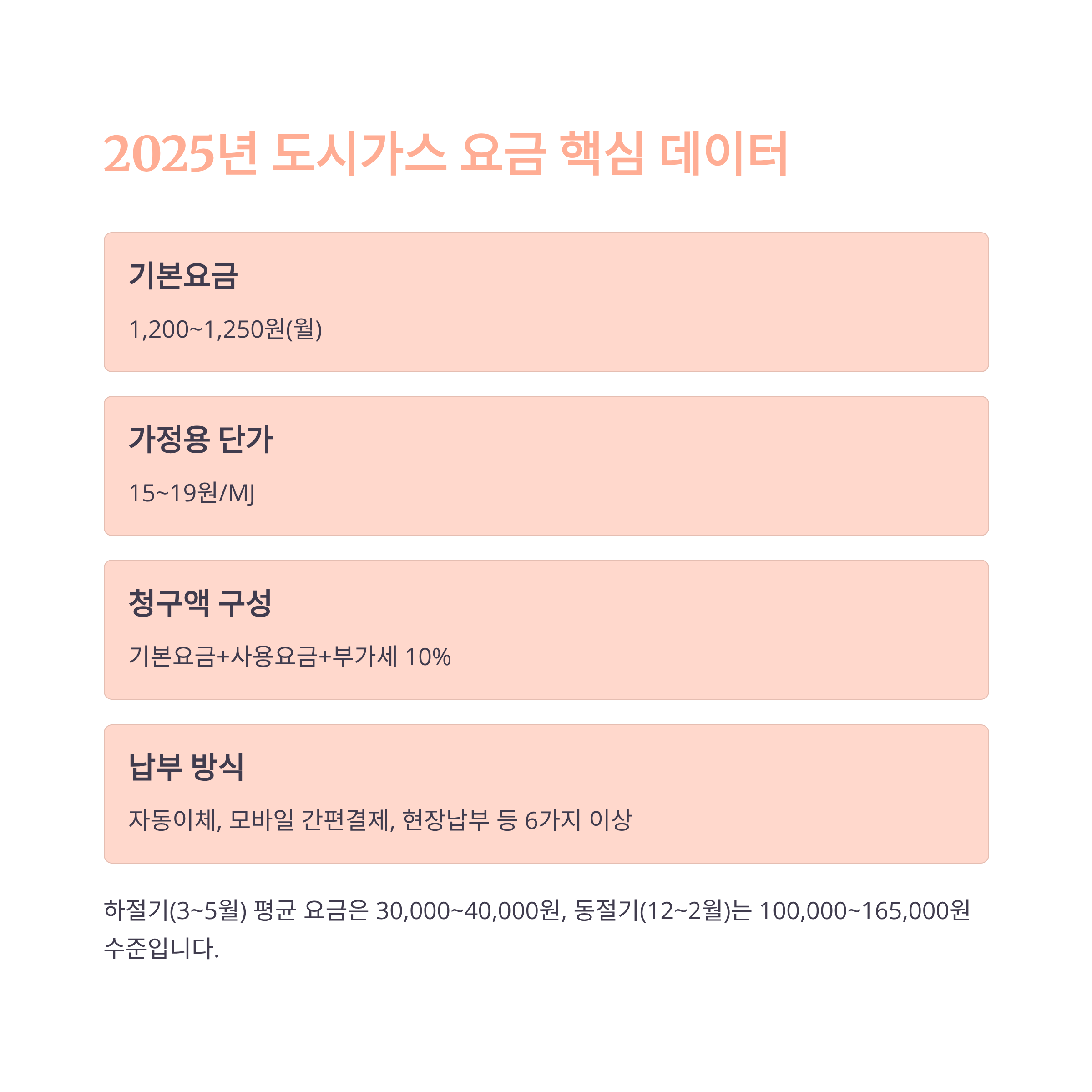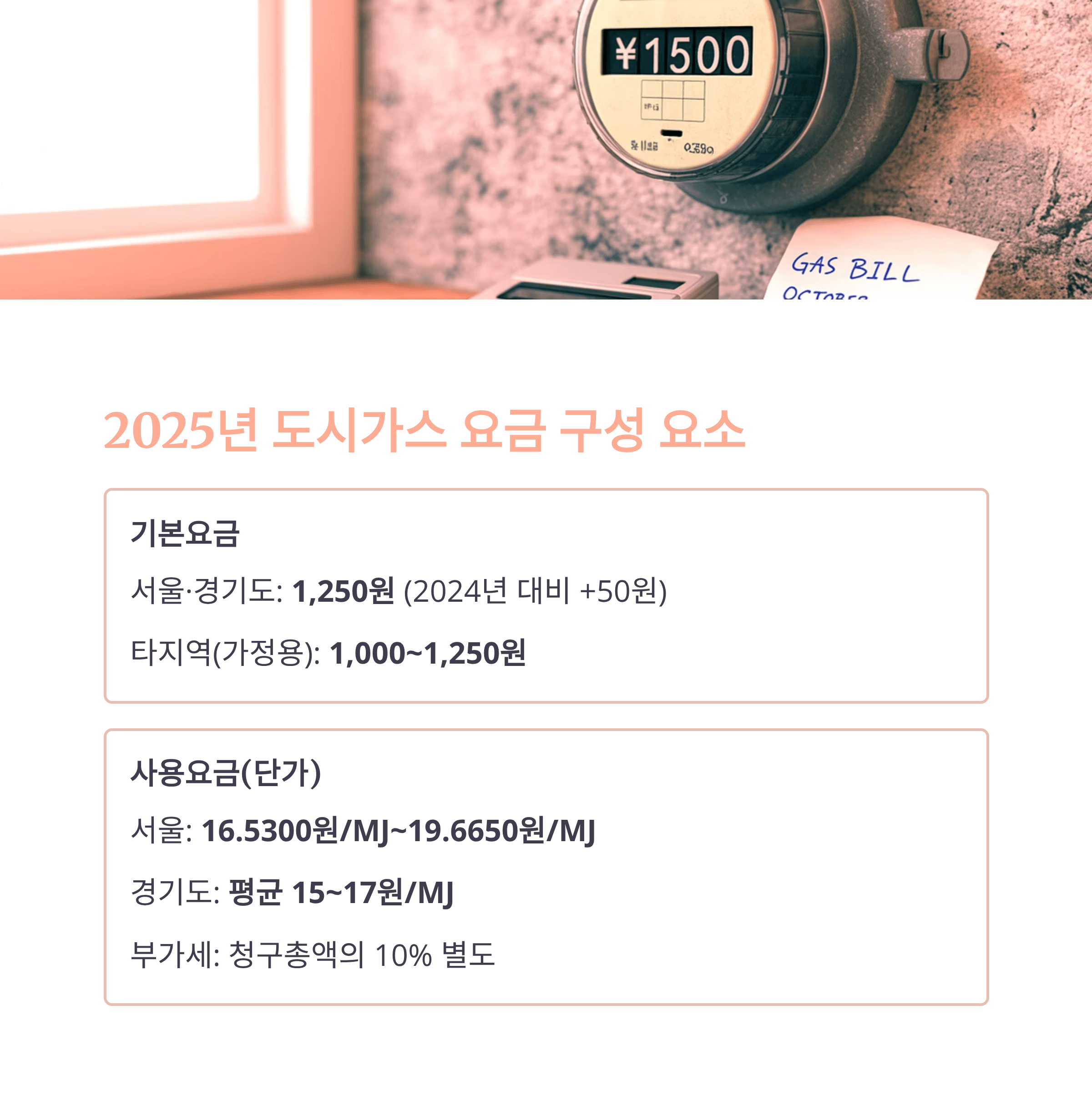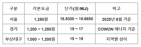 2025년부터 서울·경기 일부 지역의 기본요금은 1,250원으로 인상되었으며, 지역별 단가는 15~19원/MJ 범위에서 적용됩니다.