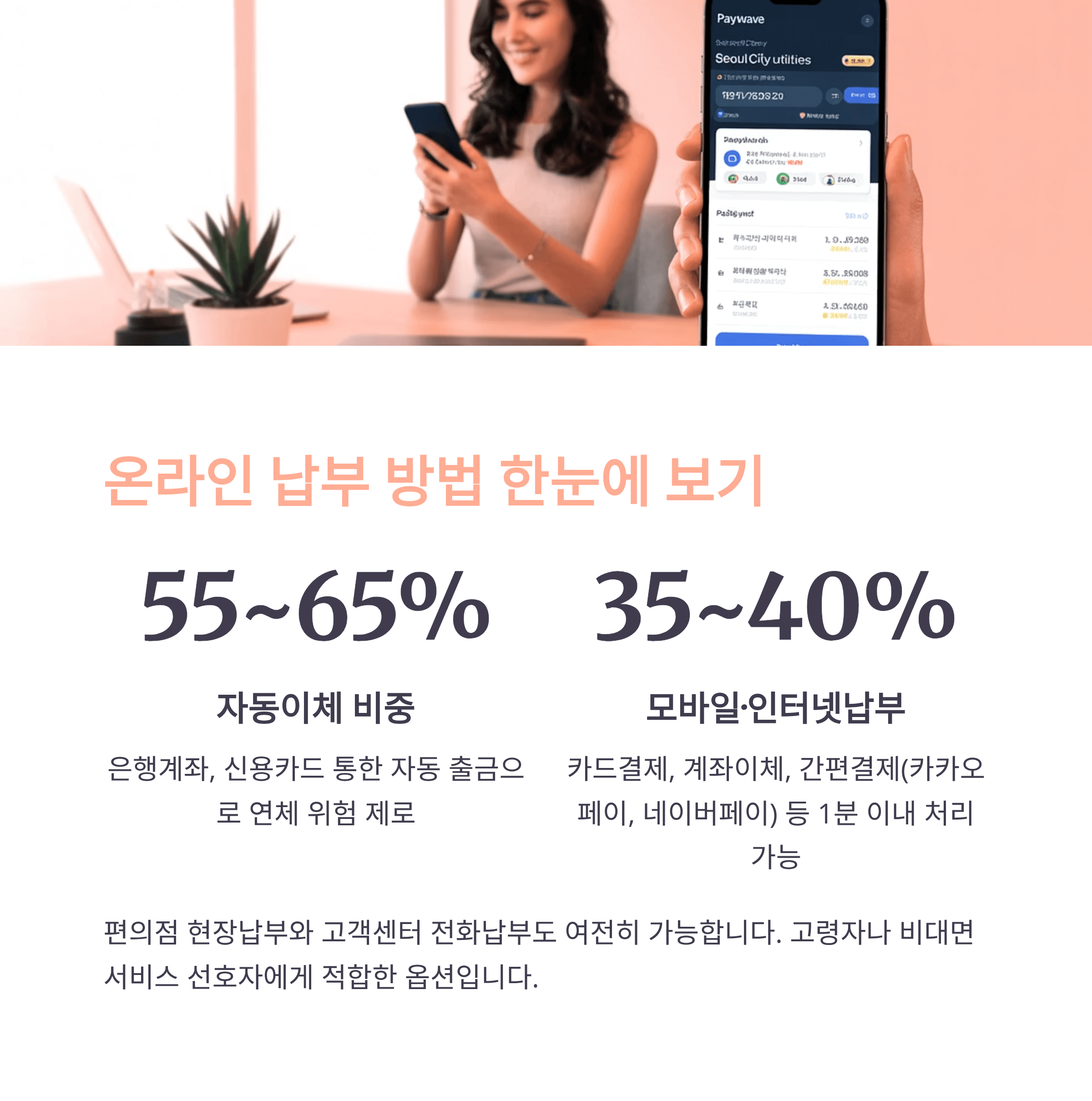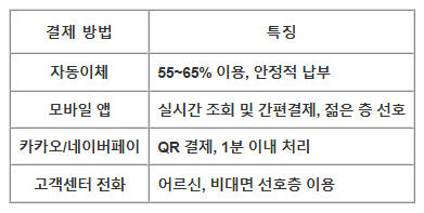 최근에는 모바일 간편결제 이용률이 꾸준히 늘고 있으며, 전체 납부 중 35~40%를 차지합니다.